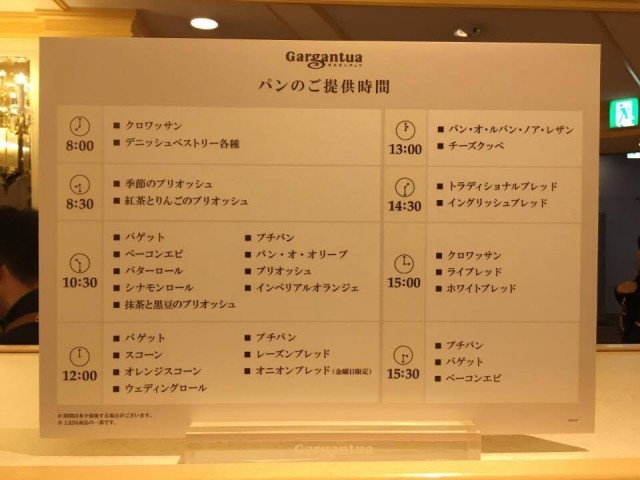 ホテル内レストランにもパンを提供しているので、多少なりとも時間の前後はあるようですが、だいたいこちらに書かれている時間に陳列されます。