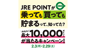 JR東日本は、エントリーの上、4つの条件のうち2つ以上を満たすと、最大1万円相当のJRE POINTが当たる「JRE POINT 最大10,000が当たるキャンペーン」を2月3日から29日まで実施する。