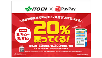 スマートフォン決済サービス「PayPay」は3月4~31日の期間、伊藤園の自動販売機のうちPayPayの支払いに対応している約4000台を対象に、20%還元キャンペーン「伊藤園の対象自販機で最大20%戻ってくるキャンペーン」を実施する。扱いとしては、3月の「いつもどこかでワクワクペイペイ」となる。