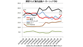 テレビ市場に異変が起きている。販売台数で不動のトップを走るシャープだが、シェアの下落が続いているからだ。2018年の秋ごろまでは安定的に3割前後のシェアを維持してきたが、直近で最後に30%を超えたのが19年の1月。以降シェアが下がり続け、消費税が増税された10月以降は25%を割り込んでいた。この1月は初売り効果で25.7%まで回復したが、昨年1月比で5.8ポイントもシェアを落としている。