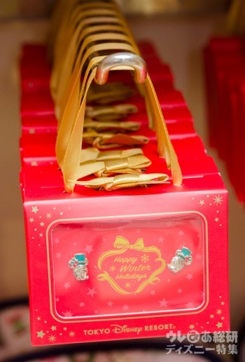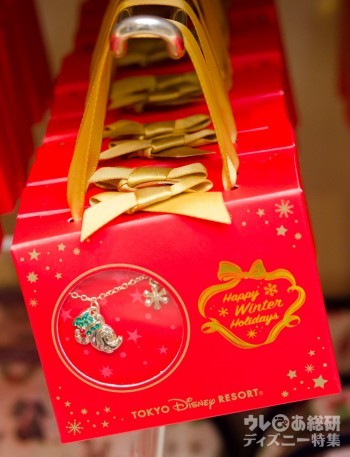 クリスマスカラーのハットをかぶったミッキーと雪の結晶のチャームがついたネックレス(1600円)は、パッケージもギフト仕様の限定グッズ。