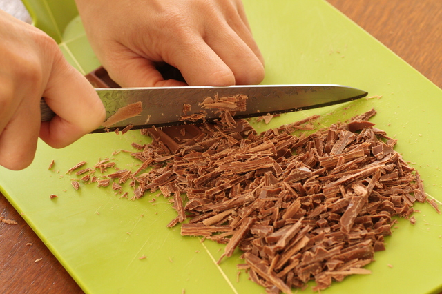 - チョコレートを粗く刻んで、500Wの電子レンジで1分20秒かけて溶かします。