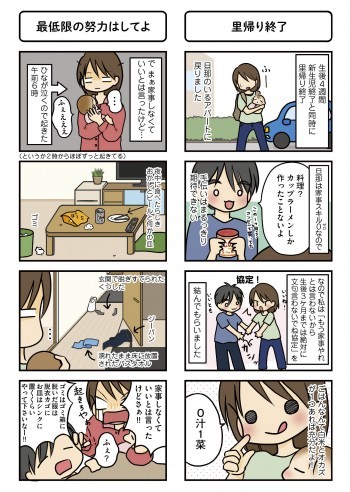 家事は手抜きしましたよ〜! どうしても済ませたい家事は午前中の、赤ちゃんが機嫌のいいときにしたり、手作り料理は1品だけであとはお惣菜に頼ったり。