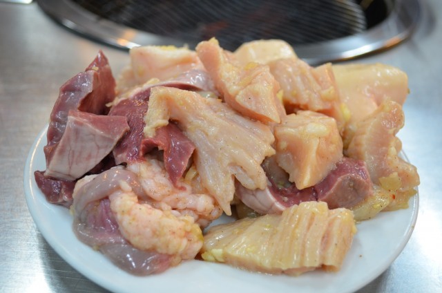 ミノとハツとシマチョウを塩系のタレでもんだもので、ビールやソジュ(韓国焼酎)を飲みながら、2人で食べるのにちょうどいい量だ。