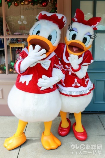 パークでは、クリスマス限定のコスチュームを着た、たくさんのキャラクターに会うことができます。