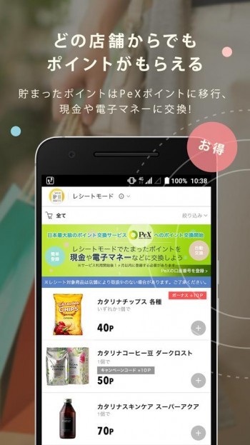 「カタリナ」の新サービス「レシートモード」は対象商品を購入し、そのレシートを写真に撮ってアプリに登録すれば、全国どこのお店で購入しても、平均14%以上の高い還元率でポイントをもらうことができます。