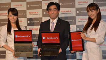 「dynabook V」シリーズは、厚さ約15.4mm、重さ約1099gの薄型・軽量設計で、76cmの落下に耐える堅牢性も備えた。バッテリ駆動時間は約17時間。液晶ディスプレイはタッチパネル対応のフルHD。スピーカーは、オーディオメーカー「ハーマン・インターナショナル」と共同開発した。