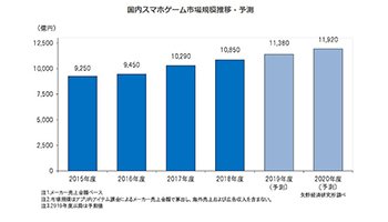 調査によれば、2018年度の国内スマホゲーム市場(メーカー売上金額ベース)は、前年度比5.4%増の1兆850億円で、有力IPを搭載した複数のゲームタイトルが常にアプリストアのランキング上位に位置し、長期にわたって人気を持続させているほか、海外メーカーや家庭用ゲーム市場を主戦場としてきた任天堂をはじめとする国内メーカーの本格参入によってマーケットが刺激され、市場の拡大につながっている。