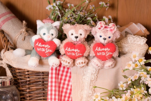 ハートを持った、ダッフィーたちのぬいぐるみストラップ。ハートの持ち方でも、個性が出ています。