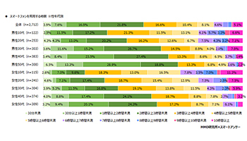 性年代別では、男性の10代でスマホの利用時間が最も多かったのは「3時間以上4時間未満」、20~30代で「2時間以上3時間未満」、50代で「1時間以上2時間未満」だった。また、女性の10~30代で「3時間以上4時間未満」、40代~50代で「2時間以上3時間未満」が最も多い。「10時間以上」と回答した年代が最も多かったのは10代女性で、唯一1割を超えた。