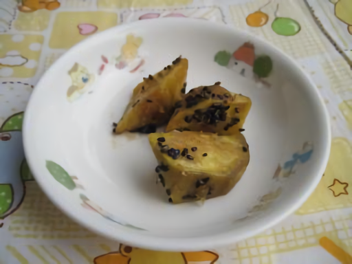 - 砂糖・しょうゆ・水を鍋で熱し、とろみが出てきたら、(1)のさつまいもを加え、からめる。