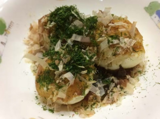 この「じゃがまる」というおやつは、オーブンで焼いて、削り節や青のりをトッピングすれば、見た目がたこ焼きにそっくりになる面白いおやつなんです。