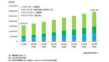矢野経済研究所は、軍用から民生用までのドローン(UAV、UAS)などの無人航空機とそのシステムを含めて世界のドローン市場を調査した。調査によれば、2025年に約2.9兆円になるという。