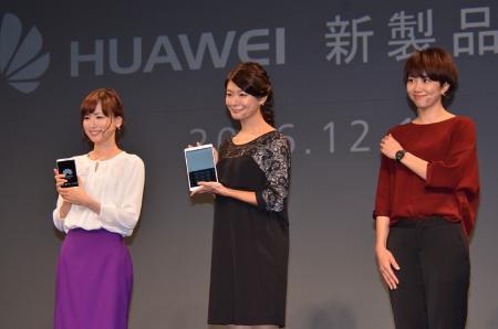 発表会では3人のプレゼンによって、最新機種のSIMフリースマートフォン「HUAWEI Mate 9」、タブレット「HUAWEI MediaPad M3」、スポーツリストバンド「HUAWEI FIT」が発表された。