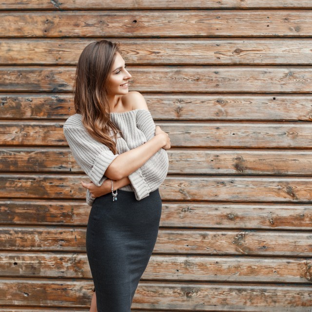 フワモコのニットでもポートネックや深いVネックで鎖骨が見え、七分袖で手首が出るようなデザインを選べば太って見えません。