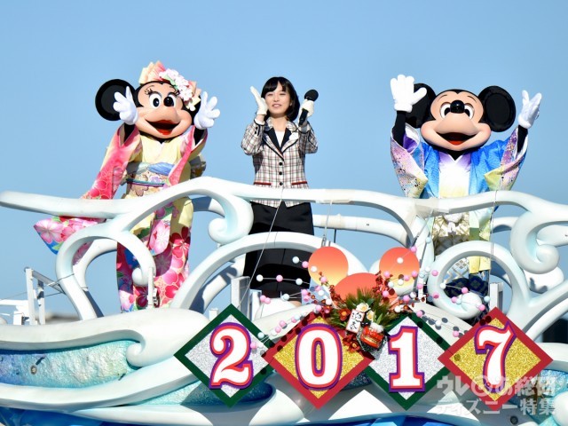 華やかな和服姿のミッキーマウスとディズニーの仲間たちが、2017年のサインが付いた船に乗って登場し、 ゲストに新年のご挨拶をする東京ディズニーシーの「ニューイヤーズ・グリーティング」