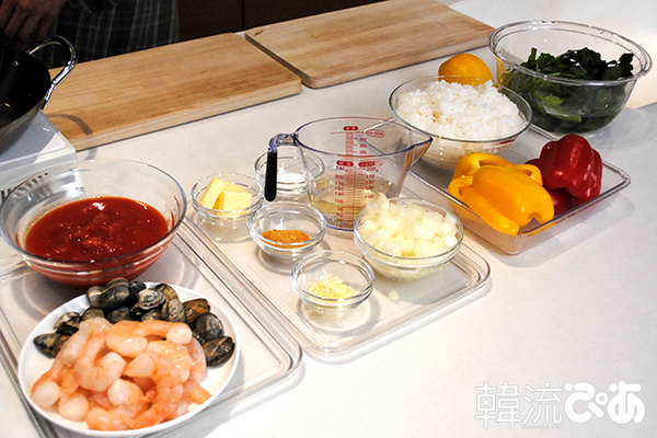 今日は魚介のパエリアなので、えびやあさりが入ります。鶏肉が好きな人は鶏肉でも大丈夫。