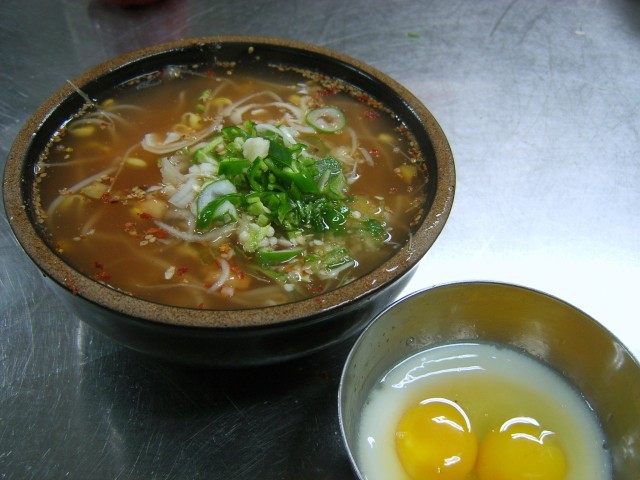 本場、全州「ヒョンデオク」のコンナムルクッパ。生卵が添えられる