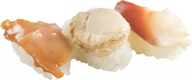 ■商品名:「貝3貫盛り」赤貝・蒸しほたて・蒸しほっき貝