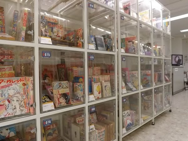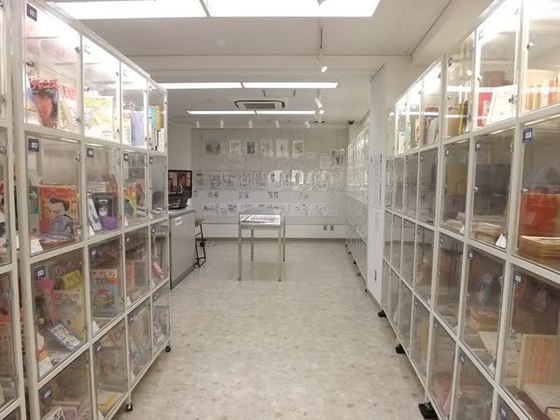 図書館1階の展示室(入場無料)へ足を踏み入れる。手前は常設展示スペースとなっており、右手にサブカルチャー系、左手に漫画系のレアな展示物が並ぶ。写真に収まっていないが左手奥にはこの施設名の由来となったコミケ(コミックマーケット)育ての親・米沢嘉博氏の業績を紹介するスペースもある。それ以外はすべて『孤独のグルメ』谷口ジロー原画展の展示だ。