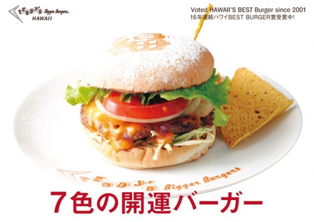 ハワイ発のハンバーガーショップ「テディーズビガーバーガー」から、幸運を招くと伝えられるハワイアンレインボー7色の食材と、縁起物であるエビを使用した「7色の開運バーガー」が、2017年1月1日より期間限定で発売されます。