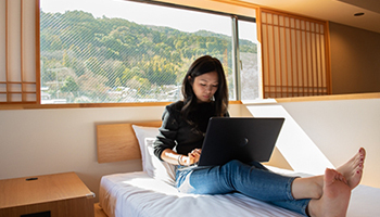 The GrandWest ArashiyamaThe GrandWest Arashiyamaは、京都嵐山にある全10室の小さなホテル。閑静な住宅街にあるため他の観光客との接触は少なく、客室数も限られているためフロントや屋上で人と会わずに仕事に取り組める。客室は、マンションの1室ほどの広さの52平方メートル以上で、子どもも自宅のように遊べる広さが十分にあり、子連れリモートワークも安心となっている。