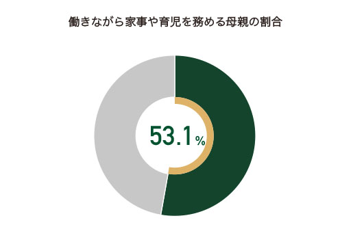 昨今、共働き世帯が過去最高(男女共同参画白書平成30年度)を更新する中、今回調査を行った母親の53.1%が働きながら家事、育児に取り組んでいることが分かったのですが、アンケート結果を見ても、家事、育児の大半は母親が担っているという実情。