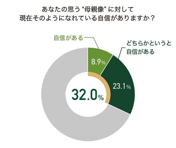 こうして、母親や自分なりに工夫して家事・育児を行っているものの「あなたの思う母親像に対して、現在、そのようになれている自信はありますか?」との質問に対し「自信がある」または「どちらかと言えば自信がある」と回答した母親は32.0%にとどまる結果に。