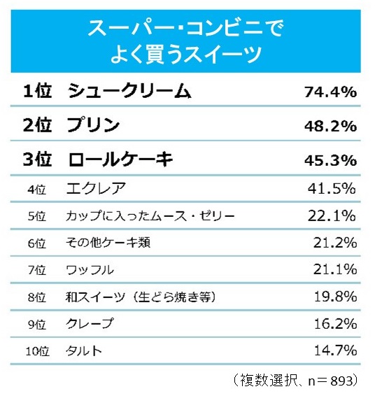 スーパー・コンビニでよく購入するスイーツは、1位が「シュークリーム」(74.4%)、2位「プリン」(48.2%)、3位「ロールケーキ」(45.3%)という結果に。