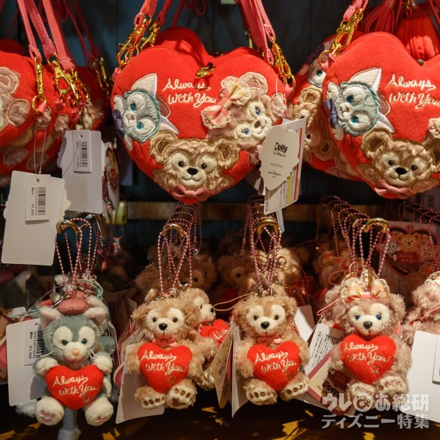 ダッフィー、シェリーメイ、ジェラトーニがハートを抱えているストラップ(各1,500円)や、スマートフォンケース(3,500円)、トートバッグ(2,900円)が販売されています。