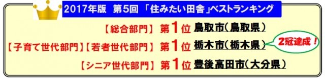 定住促進に積極的な市町村を対象に、10ジャンル82項目の総合アンケートと、若者世代・子育て世代・シニア世代の世代別に住みやすさを測る79 項目のアンケートを実施し、田舎暮らしの魅力を数値化し、【総合部門】【若者世代部門】【子育て世代部門】【シニア世代部門】の4つのランキングを発表しました。