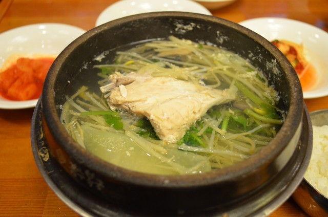 澄んだスープは淡白で日本人好み。たっぷり入ったセリが清涼感を添えている。韓国らしい刺激がほしければ、ウンポッチリに唐辛子粉を加えたウンポッメウンタンもある。いずれも前の晩、お酒を飲み過ぎたときの朝食にぴったりだ。