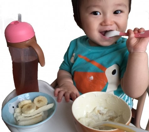 1歳頃からは、テーブル上にスプーンも置くようにします。2歳半くらいまでかけてじっくり、手づかみとスプーンの両方で食べさせるといいようです。