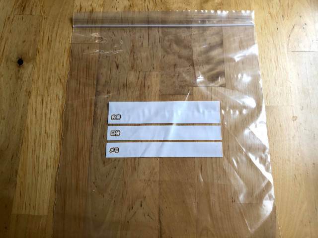 こちらはLサイズ(28cm×26cm)ですが、ほかにも中サイズ(20cm×18cm)もあり、20枚入りで104円。どちらも圧倒的なコスパを誇るフリーザーバックとして人気です。