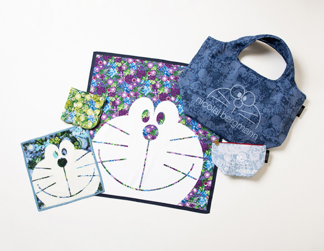 こちらはドラえもんのブルーをイメージしたカラーを中心に展開。フラワーボックスをイメージしたデザインのハンカチに「ドラえもん」が刺繍で表現されるなど、バッグやポーチも含めコラボレーションならではのデザインを楽しむことができます。