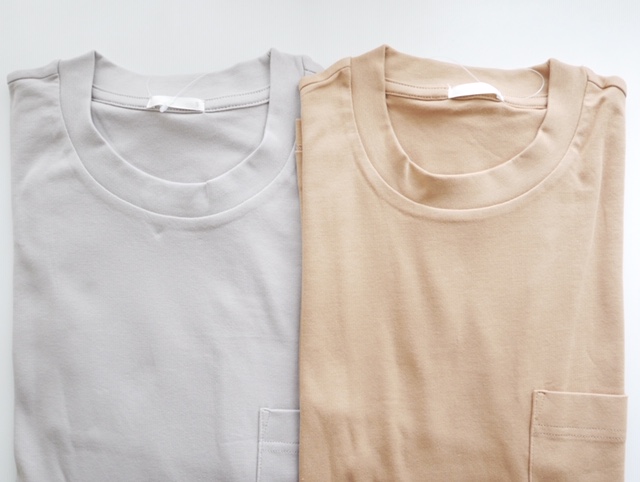 先に紹介したVネックTシャツよりも赤みのあるベージュのようなカラーで、こちらも高級セレクトショップにあるTシャツにあるような、お値段以上に見える、高見えTシャツです。
