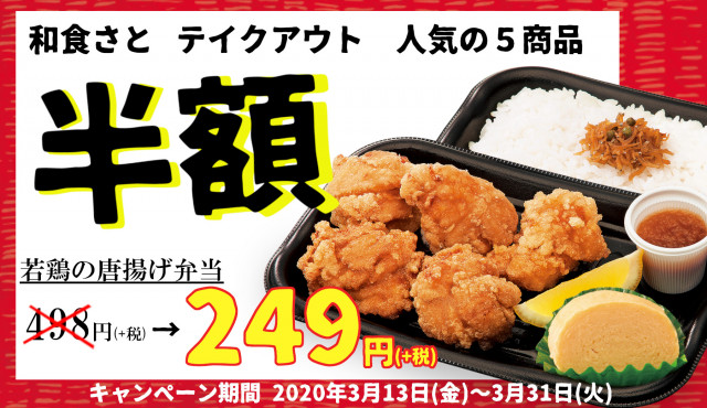 和食ファミリーレストラン「和食さと」にて、全国204店舗で人気のテイクアウトメニューが半額になるキャンペーンが、3月13日(金)~3月31日(火)の期間、開催されています。