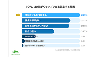 調査対象者に、「なにがあると、特にひどいアプリ(くそアプリ)だと思いますか?」を尋ねたところ、10代・20代では平均約25%が「強制終了したり固まる」と回答した。