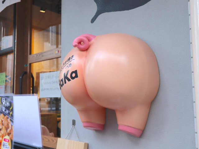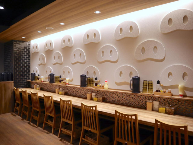 「ブタ食堂」ののれんをくぐると、木を基調とした落ち着いた雰囲気が広がっている店内。テーブル席とおひとり様でも利用できるカウンター席があります。 白い壁には、大きな豚鼻のアイコンがずらりと並び、女性にも入りやすいかわいい雰囲気が印象的です。