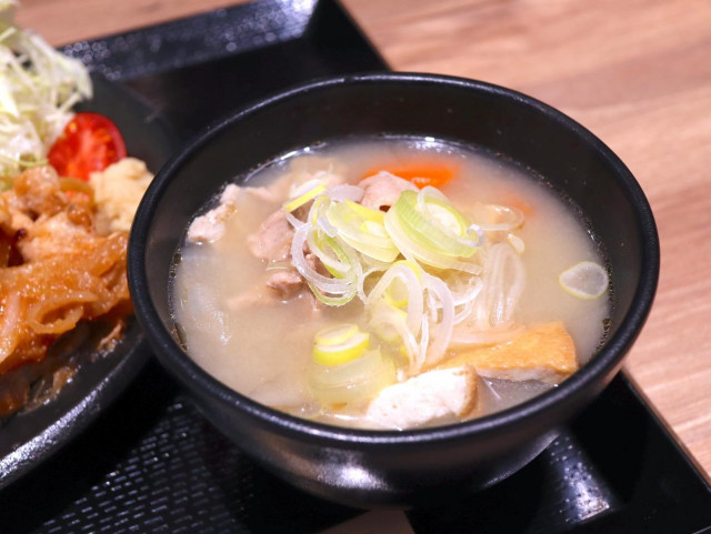 白味噌ベースのブタ汁には、豚バラ薄切り肉をはじめ人参、ごぼう、厚揚げなど具沢山! 野菜も摂れて大満足です。