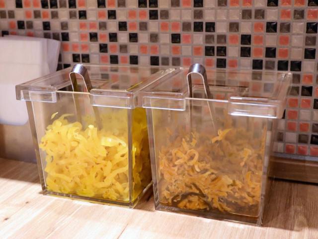 テーブルには、たくあんと刻みしょうがが設置されていて、嬉しいことに自由に食べることができます。ご飯のお供には最高ですね。