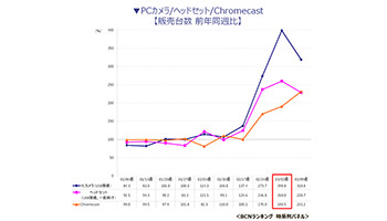 全国の主要家電量販店・ネットショップのPOSデータを集計した「BCNランキング」によると、新型コロナウイルスの感染拡大を防止するために企業が在宅勤務やリモートワークを推奨していることで、関連する商品が売れていることが分かった。3月2日週(3月2~8日)には、PCカメラが前年同週比398.8%、LANアダプター(LANカード)が119.8%と伸びを示した。