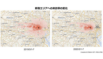都心繁華街を、2019年の同時期と比較すると、新宿歌舞伎町エリアでは約35%、銀座では約30%人流が減少した。新宿エリアで遠方から訪れる人が減少したことから商圏の縮小がみられており、銀座エリアで2月前半~3月初旬にかけて、来訪者数の減少が週ごとに高まっている。