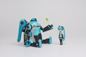 「初音ミク」のトレードカラーに染め上げたボディ、ツインテールをモチーフにした装飾など、これまでのメカトロウィーゴシリーズにはなかったシルエットが特徴。「アドベンチャータイム」仕様で立体化された初音ミクのオリジナルフィギュアが付属しており、メカトロウィーゴのコクピットに搭乗させることも可能。
