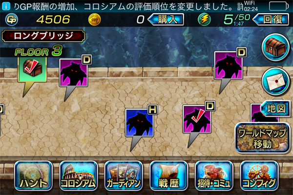 フィールドからダンジョンに入ると、敵や宝箱のアイコンがあちこちにあります。敵をタップすると戦闘に入ります。戦闘には1回あたりバトルポイントを5ポイント消費し、これは3分で1回復する他、課金アイテムを使って全快することもできます。