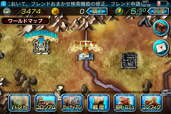 こちらがフィールド画面。本作は「ミッション」と呼ばれるイベントをこなしていくことでストーリーが進行します。公式サイトによると「1000年前に滅んだはずの神獣が復活した謎を解き明かす」というストーリーのようですが、いくつかミッションをクリアした現段階ではまだストーリーに引き込まれる感じはありません。今後の展開に期待したいところ。またサブミッションとは、ストーリーに直接関係しないサブイベントです。