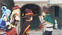 差し押さえによってガランとした屋敷で寒さをしのいでいるカズマたちの前に、突如乱入してきた謎の金髪美女!…と思いきや、それはなんとダクネス。
