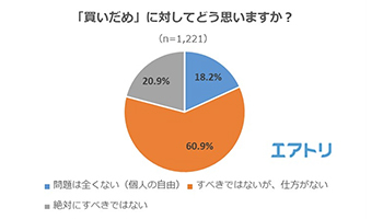 エアトリが2020年3月22~24日に20代以上の男女1221人に実施した「買いだめ」に関するネット調査によると、「買いだめ」についてどう思うかという質問に、18.2%が「問題は全くない(個人の自由)」、60.9%が「すべきではないが、仕方がない」と回答し、「絶対にすべきではない」と答えたのは20.9%だった。