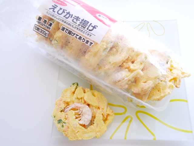 予め油でしっかりと揚げた、えびのかき揚げが10個。税抜262円なので、一枚あたり、約27円!