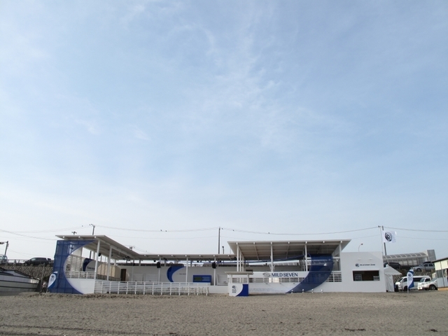 海岸を歩いて行くと建物を発見。めちゃめちゃさわやかな雰囲気! 今回で6年目を迎えるビーチハウス『BLUE WINDY ZONE』は、成人限定の海の家です。